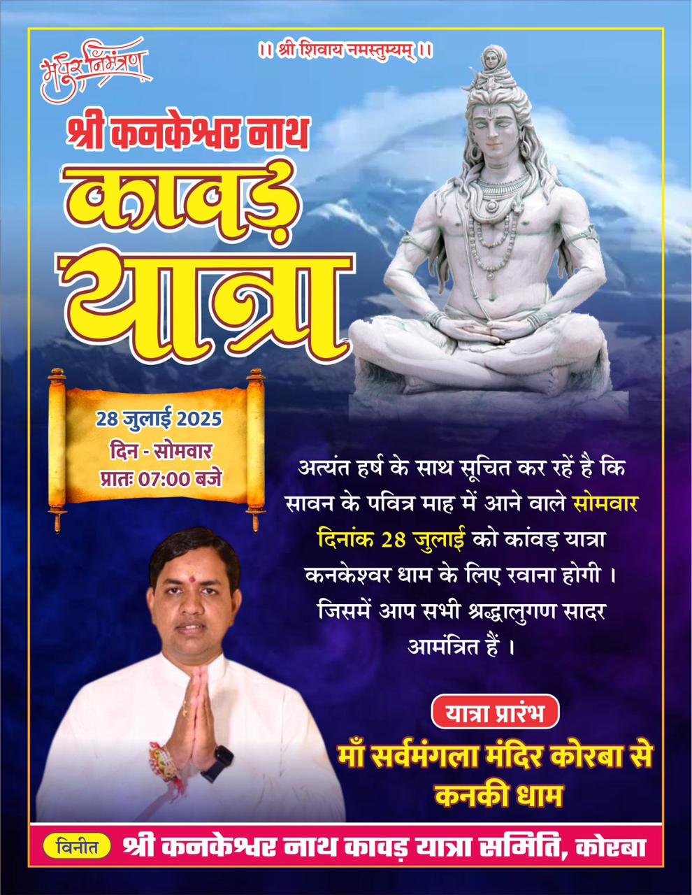 कोरबा। श्रावण मास की पावन बेला में भगवान भोलेनाथ की भक्ति में रंगे कोरबा जिले में एक भव्य कांवड़ यात्रा का आयोजन किया जा रहा है। यह यात्रा 28 जुलाई, सोमवार को प्रातः 7 बजे शुरू होगी, जिसका शुभारंभ नगर पालिक निगम वार्ड क्रमांक 18 के पार्षद एवं भारतीय जनता युवा मोर्चा (भाजयुमो) के जिला महामंत्री नरेंद्र देवांगन के नेतृत्व में होगा।