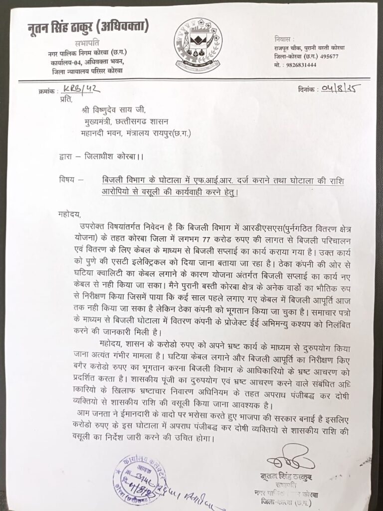 कोरबा।नगर पालिक निगम कोरबा के सभापति नूतन सिंह ठाकुर ने बिजली विभाग में हुए करोड़ों रुपये के कथित घोटाले का मुद्दा जोर-शोर से उठाते हुए मुख्यमंत्री विष्णुदेव साय को पत्र लिखा है। उन्होंने इस घोटाले की उच्चस्तरीय जांच, दोषियों पर एफ.आई.आर. और शासन की राशि की वसूली की सख्त मांग की है।
