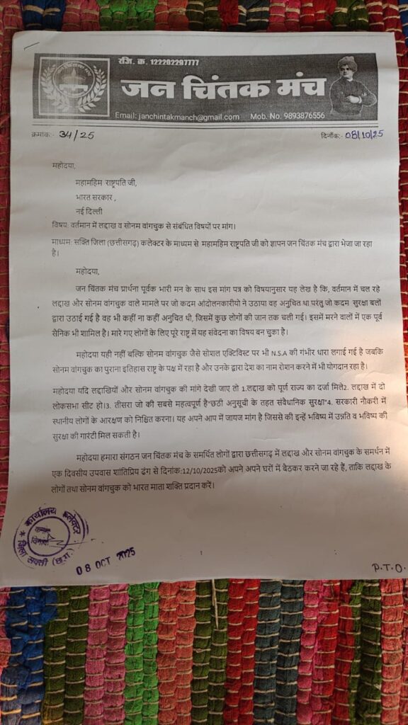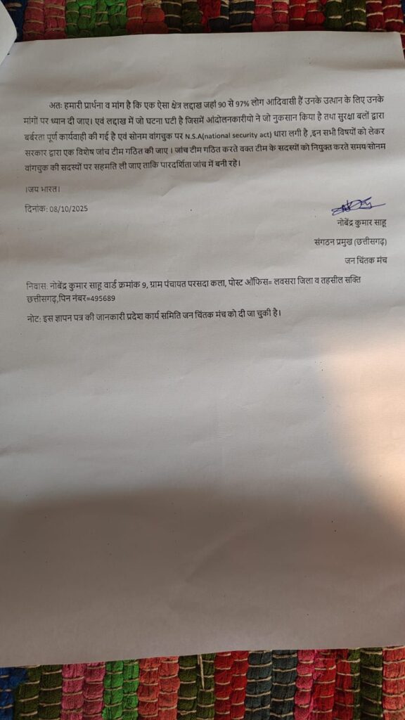 आगे पत्र में लिखते हैं कि हमारे संगठन जन चिंतक मंच के समर्थित लोगों द्वारा छत्तीसगढ़ में लद्दाख और सोनम वांगचुक के समर्थन में एक दिवसीय उपवास शांतिप्रिय ढंग से दिनांक:12/10/2025को अपने अपने घरों में बैठकर करने जा रहे हैं, ताकि लद्दाख के लोगों तथा सोनम वांगचुक को भारत माता शक्ति प्रदान करें।इसके आगे संगठन प्रमुख नोबेंद्र साहू लिखते हैं कि